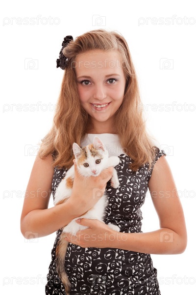 Портрет молодой красивой девушки с котенком, девушка держит котенка, изолированного на белом