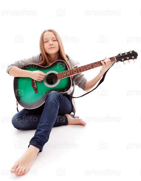 Красивая девушка с гитарой на белом фоне