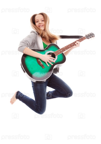 Красивая девушка с гитарой на белом фоне