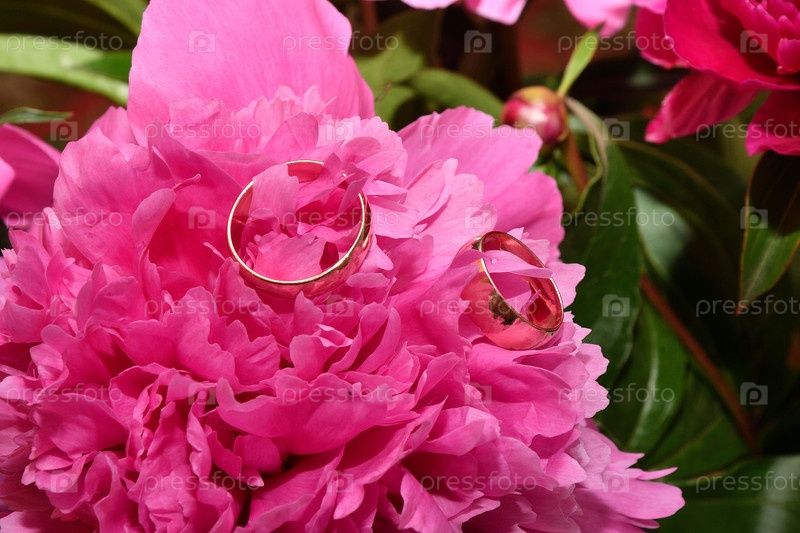 Два обручальных кольца и цветок пиона