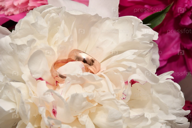 Два обручальных кольца и цветок пиона