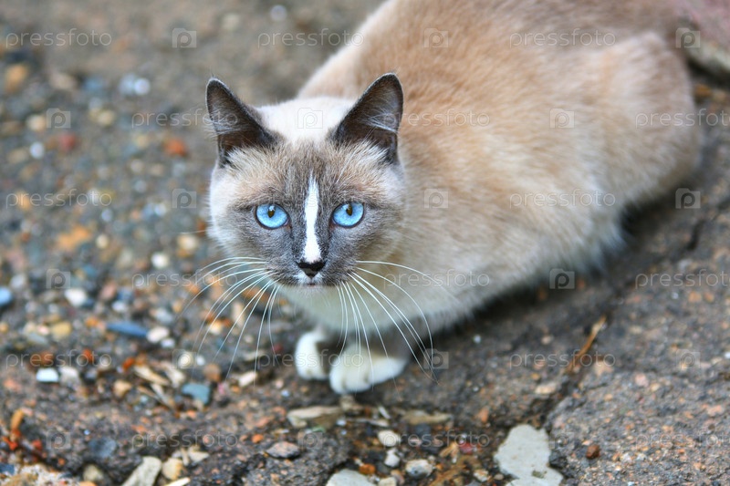 Кот с голубыми глазами гуляет на свежем воздухе