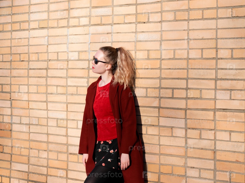 Молодая блондинка в темных очках, шерстяном пальто, красном свитере и юбке с цветочным принтом стоит у кирпичной стены в солнечный день. Весенний уличный стиль