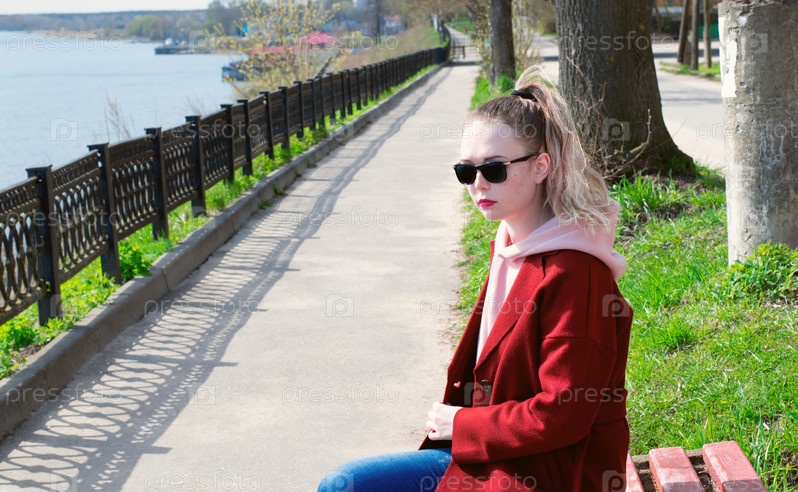 Молодая женщина в солнечных очках, толстовке с капюшоном и красном пальто сидит на скамейке на набережной в солнечный день