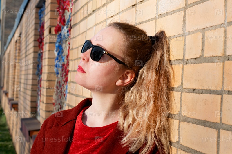 Молодая блондинка в темных очках и с хвостиком стоит у кирпичной стены в солнечный день. Весенний уличный стиль