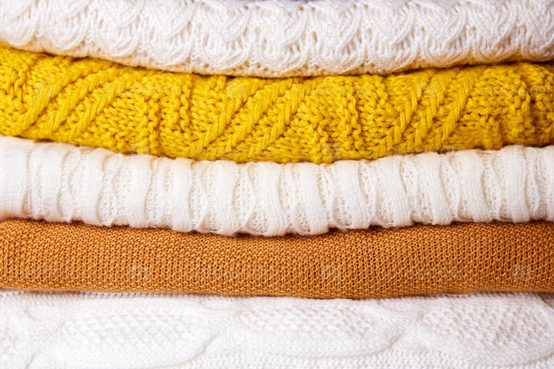 Стопка сложенных вязаных свитеров. Осенняя и зимняя шерстяная одежда