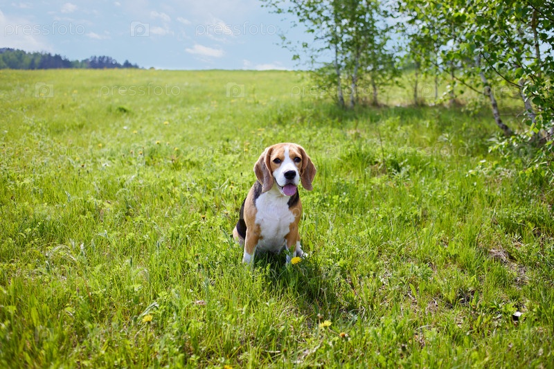 Симпатичная собака-бигль сидит на траве на летнем лугу