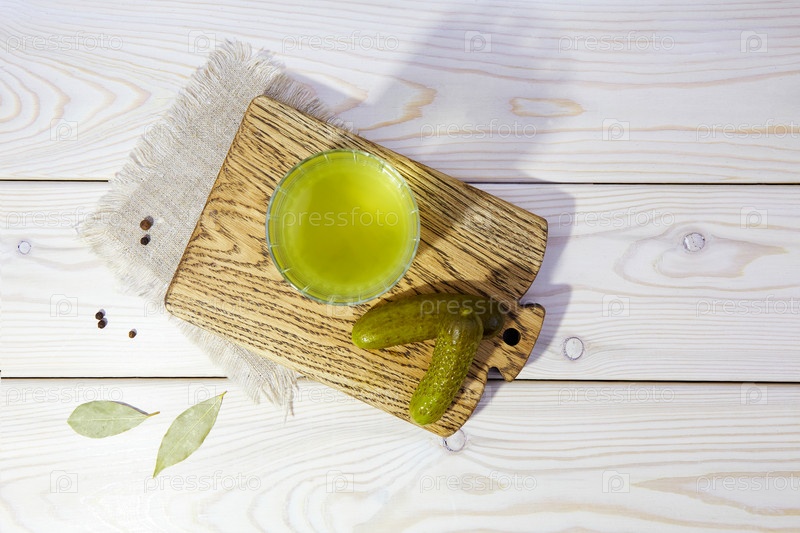 Огуречный сок или огуречный рассол на белом деревянном фоне. Здоровый энергетический напиток для спортсменов