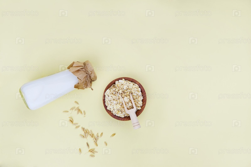 Овсяное молоко в бутылке, овсянка в миске на желтом фоне. Растительное молоко
