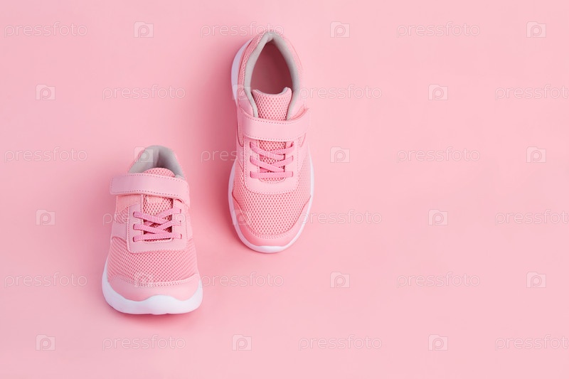 Розовые кроссовки на розовом фоне. женская спортивная обувь
