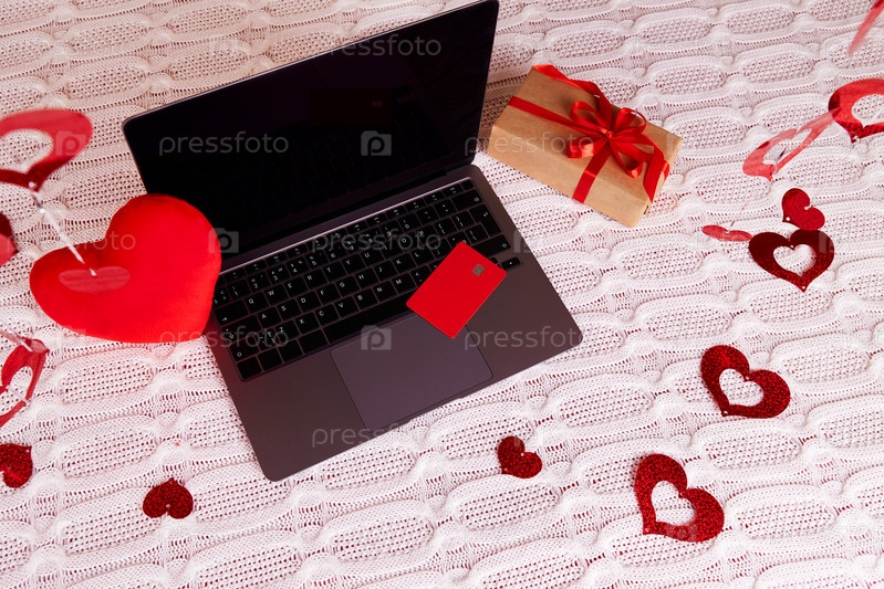 Покупки онлайн на День святого Валентина. Ноутбук, кредитная карта, подарок, декор, сердечки на белом вязаном одеяле