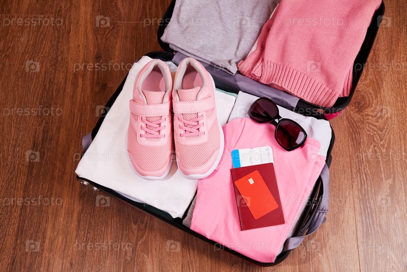Открытый чемодан с одеждой, кроссовками, солнцезащитными очками. Паспорт, карта, билеты на поездку