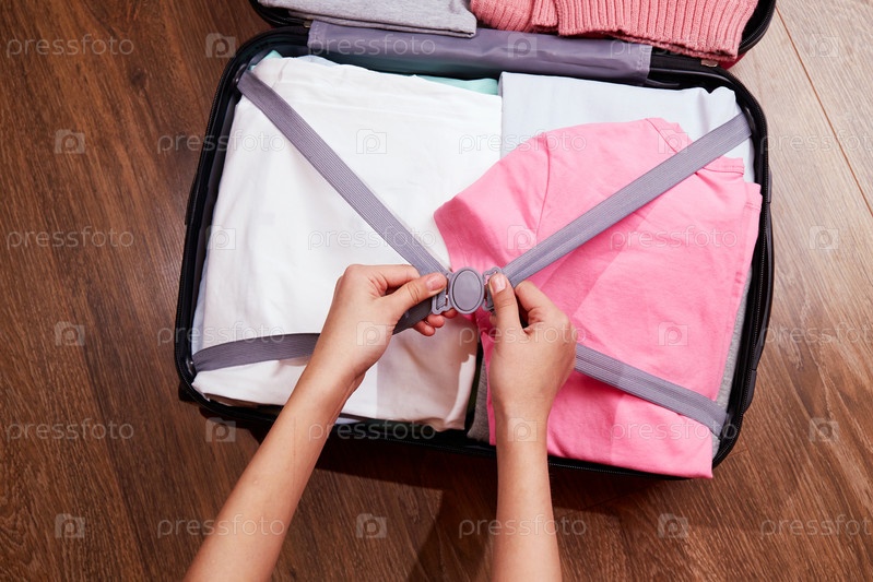 Руки девушки упаковывают летнюю одежду в чемодан. Багаж для путешествий и отдыха