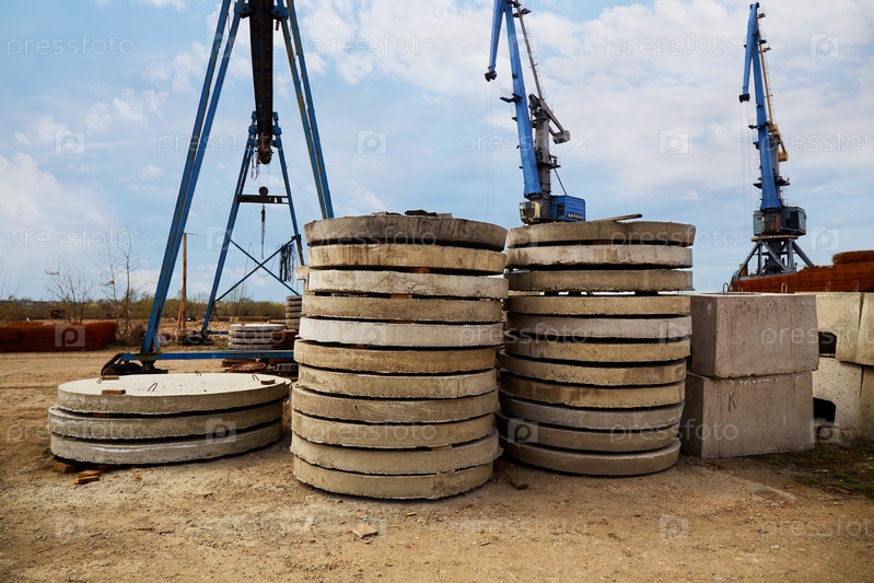 Железобетонные изделия на строительной площадке. Промышленное производство строительных конструкций