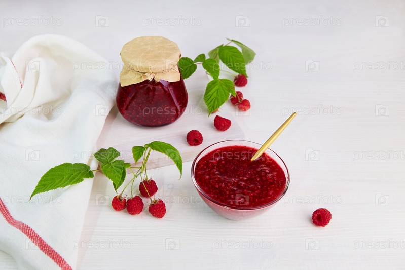 Малиновое варенье в стеклянной банке и миске. Консервация и летний урожай