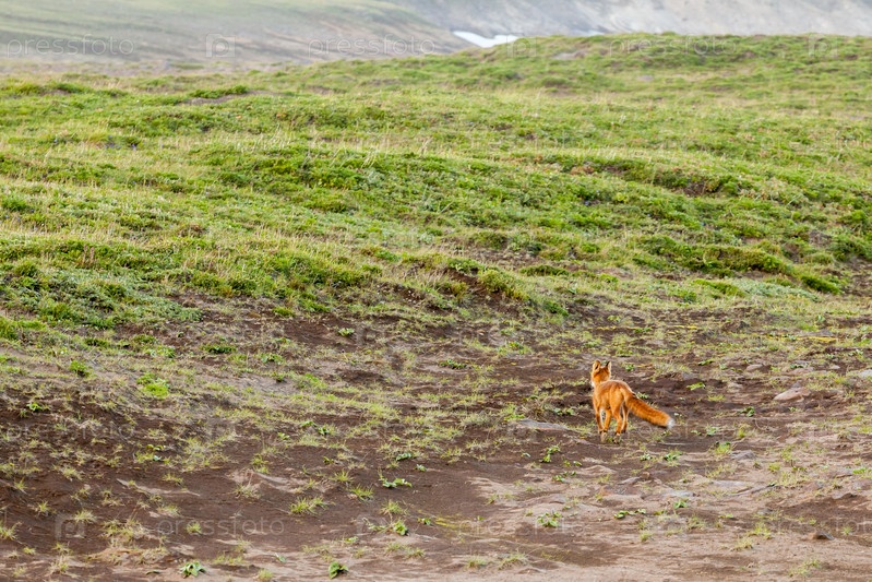 Дикая лиса (Vulpes vulpes beringiana) убегает. полуостров Камчатка, Россия