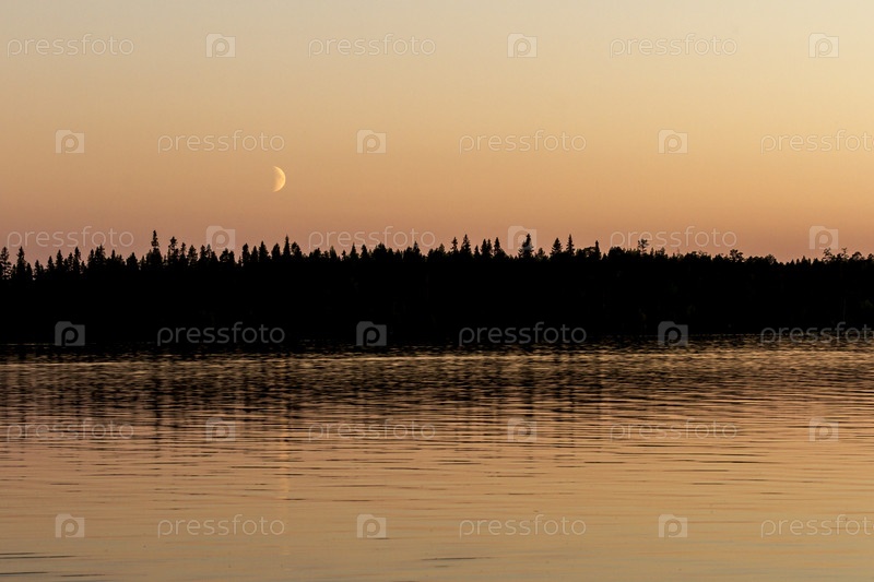 Луна над темным ночным лесом у озера. Мистический фантастический сказочный фон