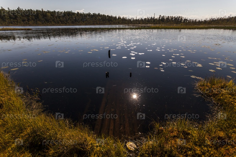 Болото возле соснового леса в полдень, Карелия, Россия