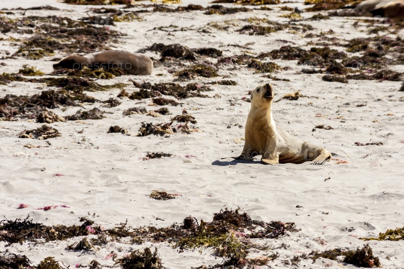 Маленький милый австралийский морской лев зовет свою маму. Береговая линия острова Кенгуру, Южная Австралия, залив Сил