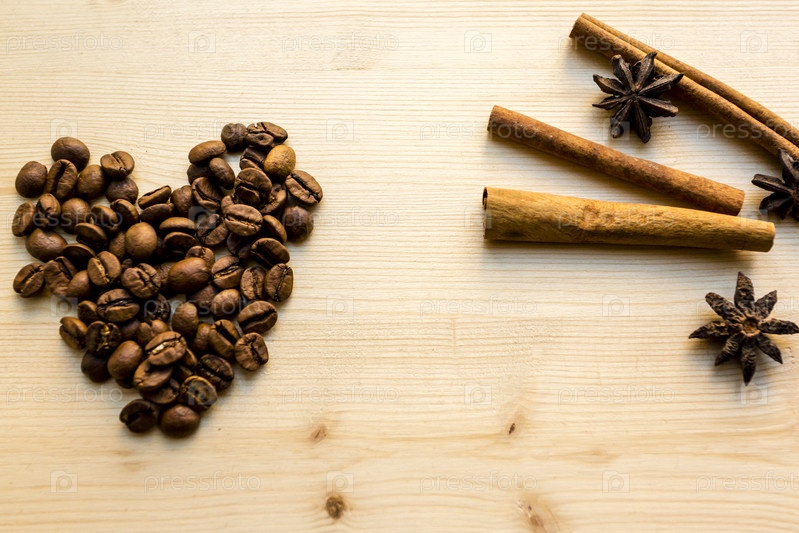 Корица, анис и кофе как сердце. Концепция романтического утра, Дня святого Валентина, дня рождения. Романтический художественный образ