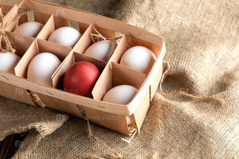 Откройте экологически чистую деревянную коробку с белыми яйцами и одним красным пасхальным яйцом на грубой мешковине