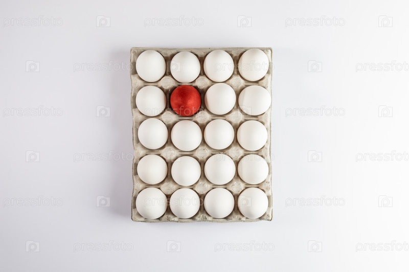 С белыми яйцами и одним красным пасхальным яйцом на белом фоне