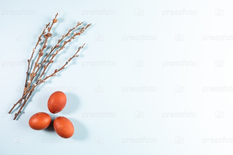 Три красных пасхальных яйца и ветки ивы на нежном бледно-голубом фоне