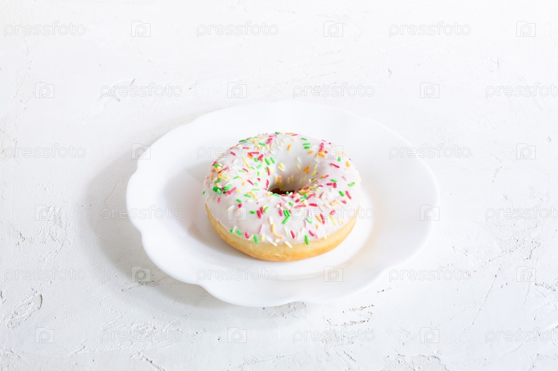 Свежий белый глазурованный пончик на фигурной тарелке на белом текстурированном фоне
