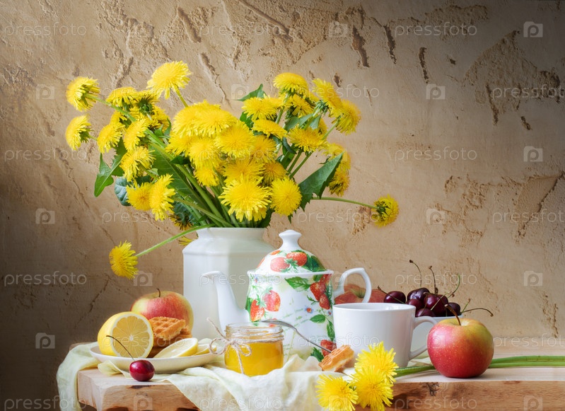 Натюрморт с одуванчиками, чайником, фруктами и медом на деревянном столе на старом потрескавшемся фоне