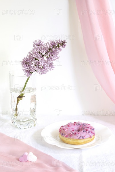 Современный натюрморт с сиреневой веткой, пончиком на фигурной тарелке, розовой тканью и маленьким зефиром в форме сердца на белом фоне
