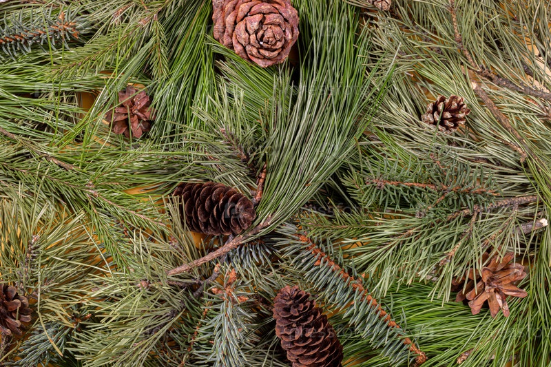 Много свежих зеленых сосновых, еловых и кедровых веток и шишек в качестве естественного фона или обоев. Вид сверху