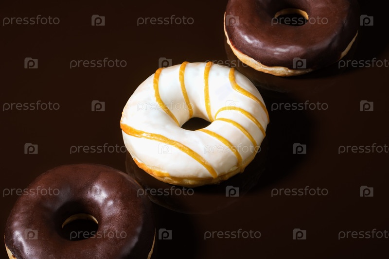 Крупным планом три глазированных пончика лежат по диагонали на фоне темного шоколада