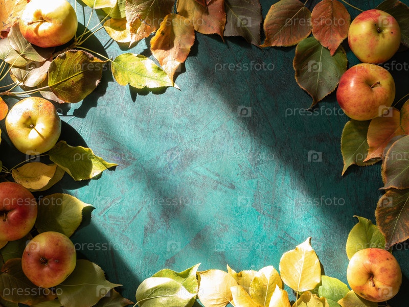 Изумрудно-зеленый фон с рамкой из спелых яблок органической фермы с осенними листьями, освещенными естественным светом из окна