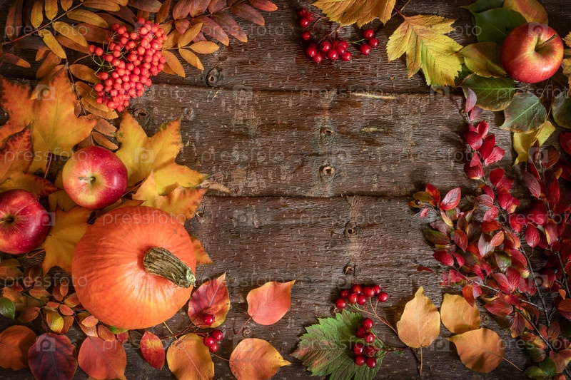 Осенний фон с рамкой из тыквы, яблок, ягод рябины и боярышника и листьев на фоне коры дерева