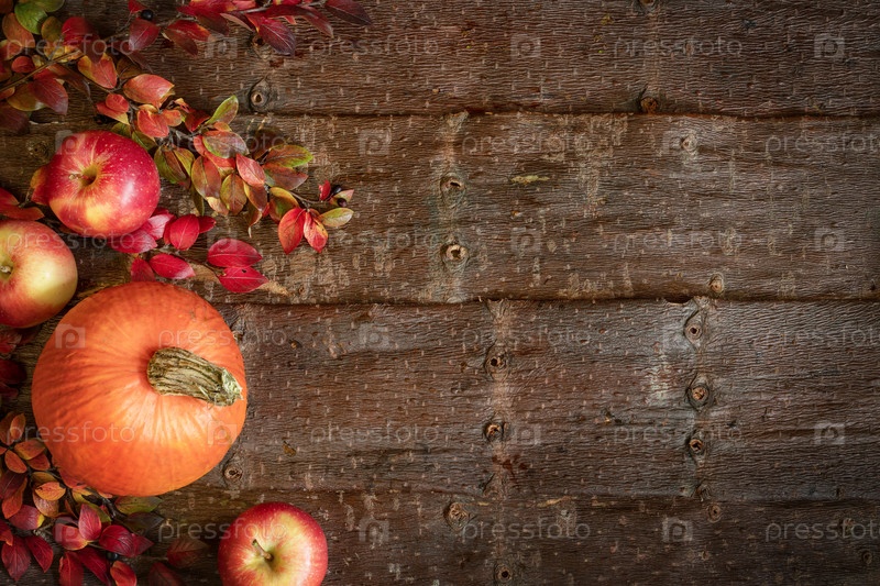 Осенний фон с тыквой, яблоками и ветвями с красочными листьями на естественном фоне коры дерева