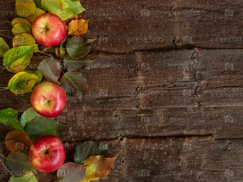 Осенний фон со спелыми фермерскими яблоками с разноцветными листьями на естественном фоне коры дерева