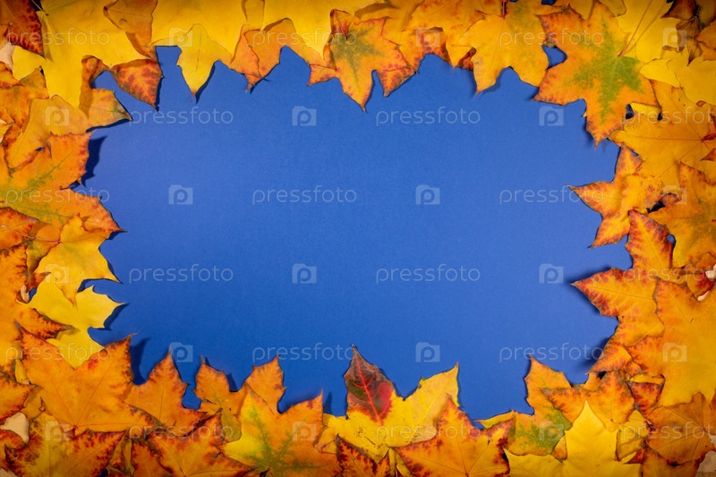 Рамка из красивых красочных кленовых листьев на синем фоне. Пустой бланк для поздравительной открытки или приглашения. Осенний фон, осенняя концепция. Вид сверху, пространство для копирования