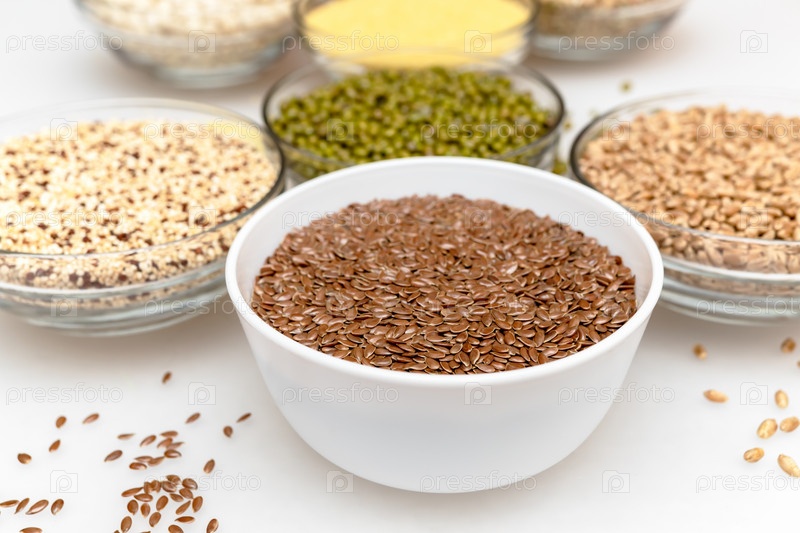 Белая миска с семенами льна на размытом фоне чашек с хлопьями