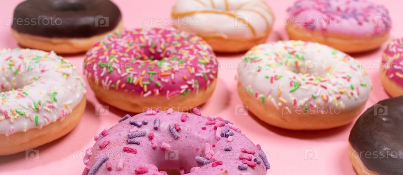 Веб-баннер. Крупным планом традиционные пончики с глазурью на модном розовом фоне