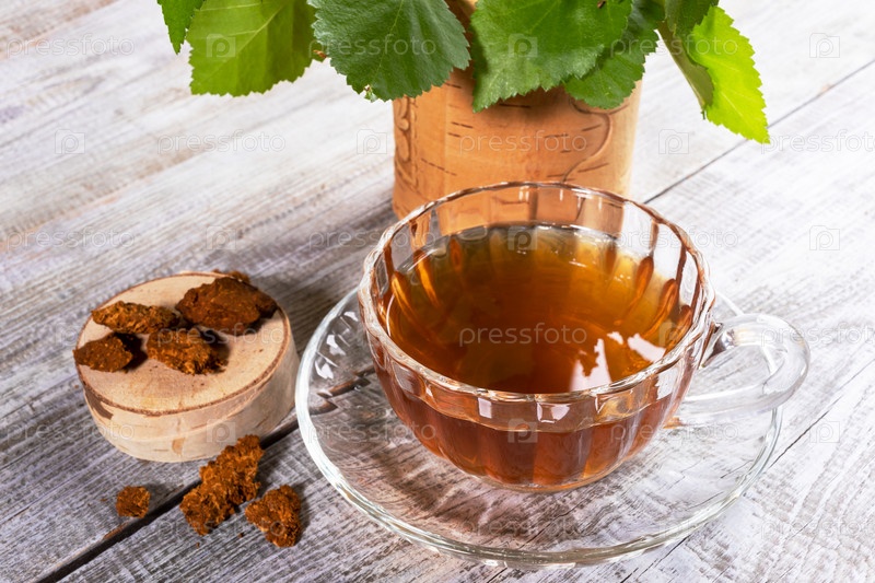 Стеклянная чашка целебного настоя чаги березового гриба, пень с кусочками чаги и листья на деревянном столе крупным планом