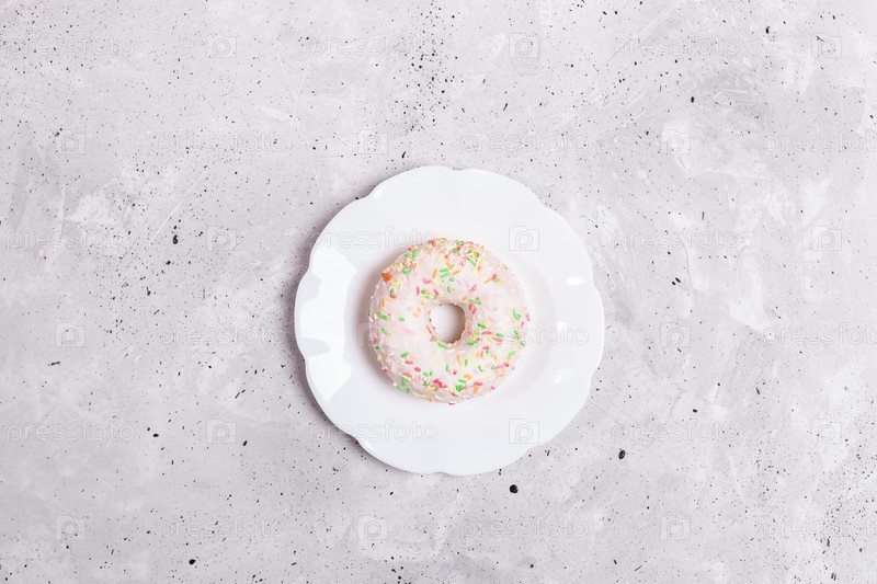 Один белый глазурованный пончик лежит на белой тарелке в центре серого бетонного фона. Вид сверху