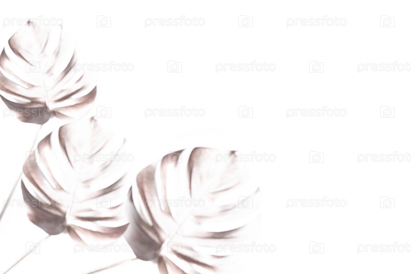 Модный белый фон с тремя нечеткими размытыми силуэтами экзотических тропических пальмовых листьев монстера и копировальным пространством