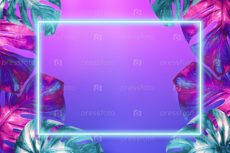 Листья монстеры окрашены в модные неоновые цвета и неоновая рамка над ними на модном розово-голубом градиентном фоне
