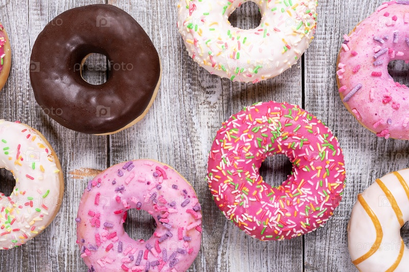 Традиционные пончики с разноцветной глазурью, выложенные на белом окрашенном деревянном фоне крупным планом