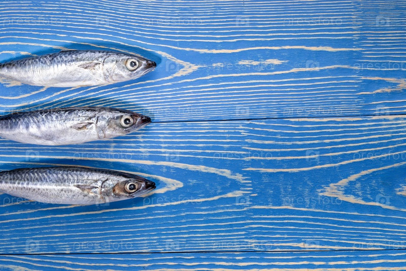 Три рыбы скумбрии выложены в ряд на окрашенном синем деревянном фоне