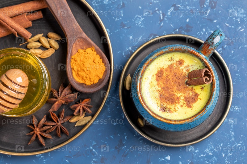 Вид сверху на чашку традиционного индийского аюрведического молока с золотой куркумой и тарелку с ингредиентами на синем фоне
