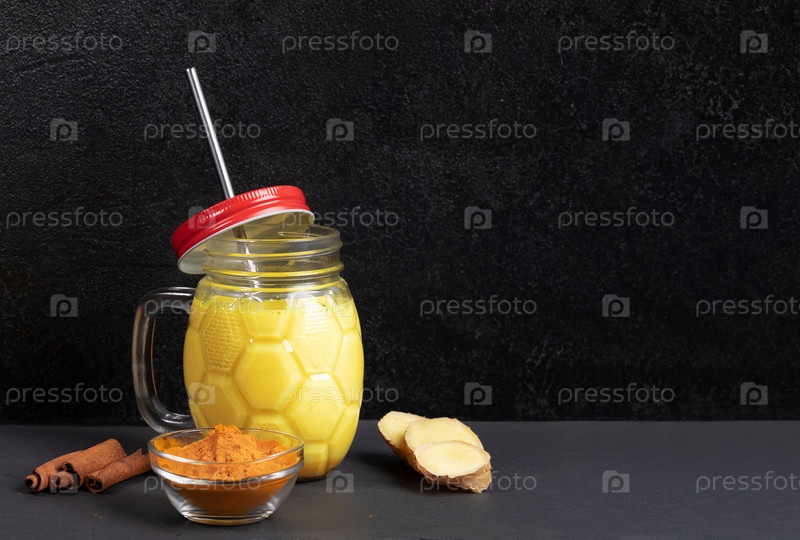 Банка Мейсона с золотым молоком куркумы с металлической соломой, ингредиенты для его приготовления на черном фоне. Копировать пространство