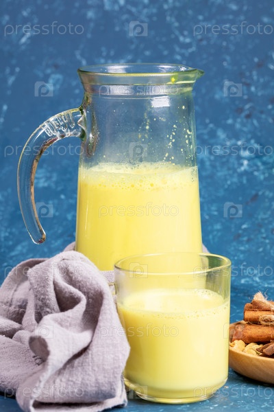Органическое молоко с куркумой. Графин и стакан с золотым молоком, салфеткой и ингредиентами на синем фоне