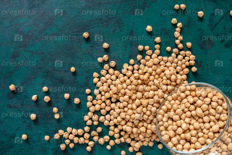 Изумрудно-зеленый фон с разбросанными по нему бобами нута из круглой стеклянной чашки