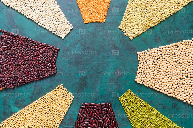 Бобовые и злаки выложены как солнечные лучи на изумрудно-зеленом фоне